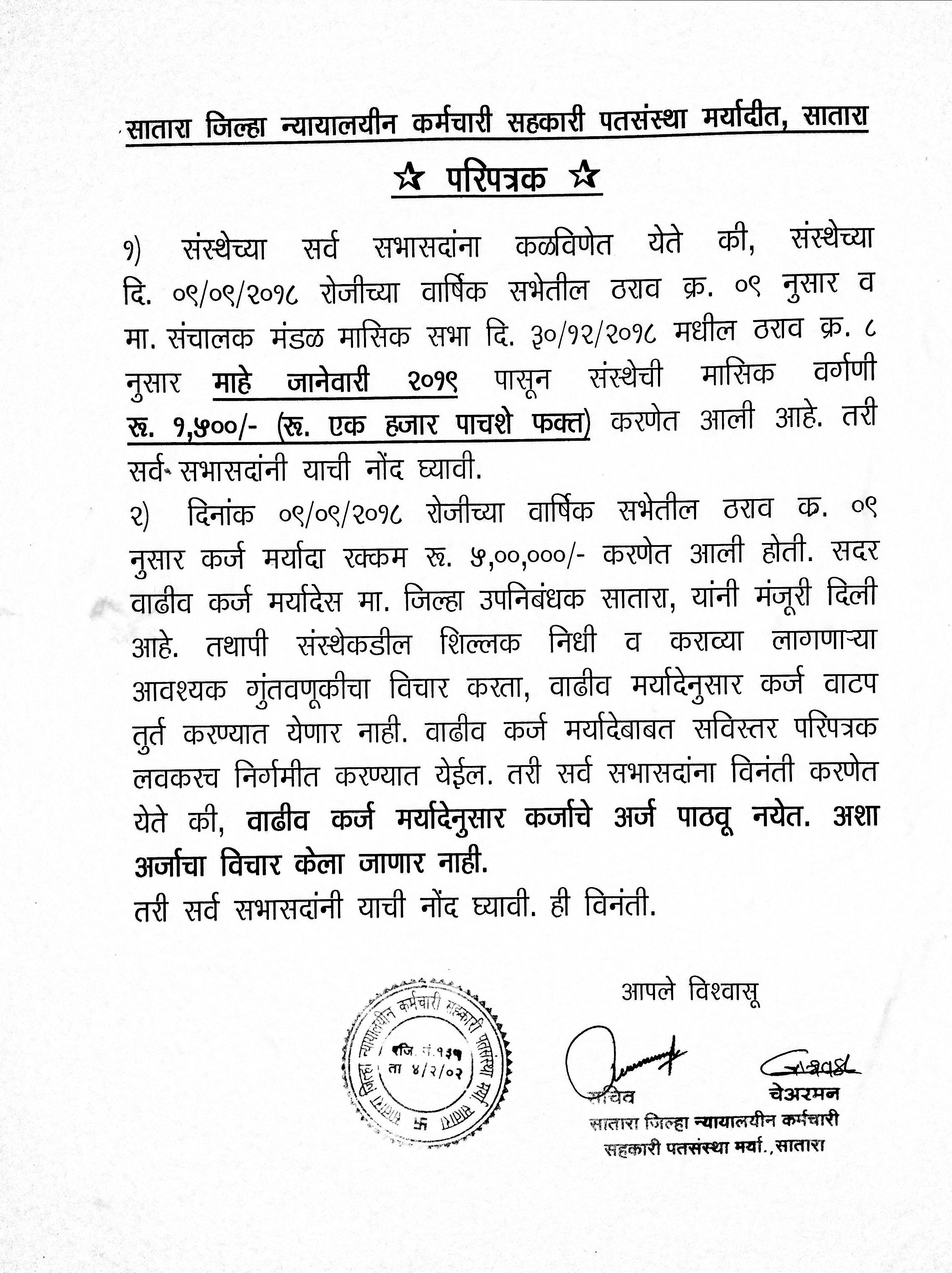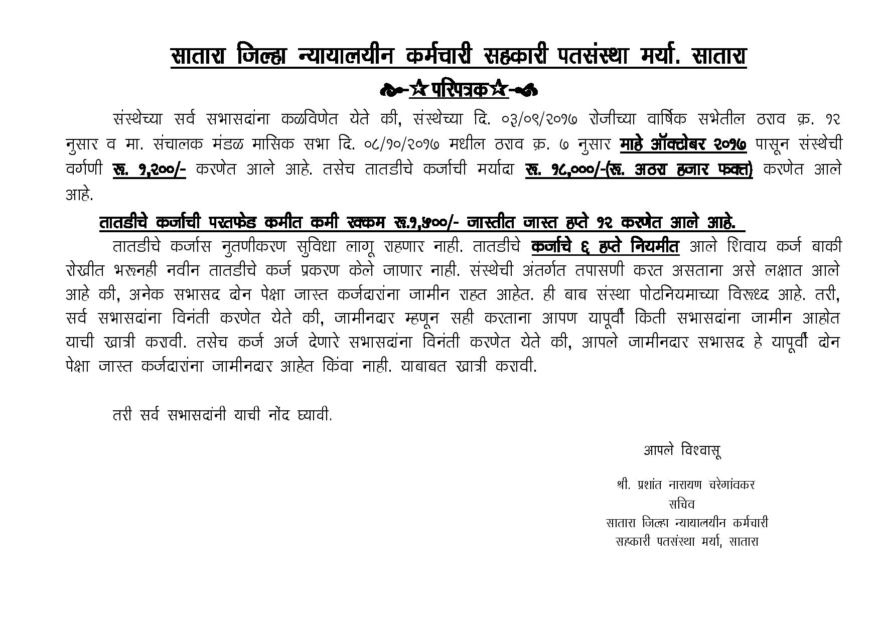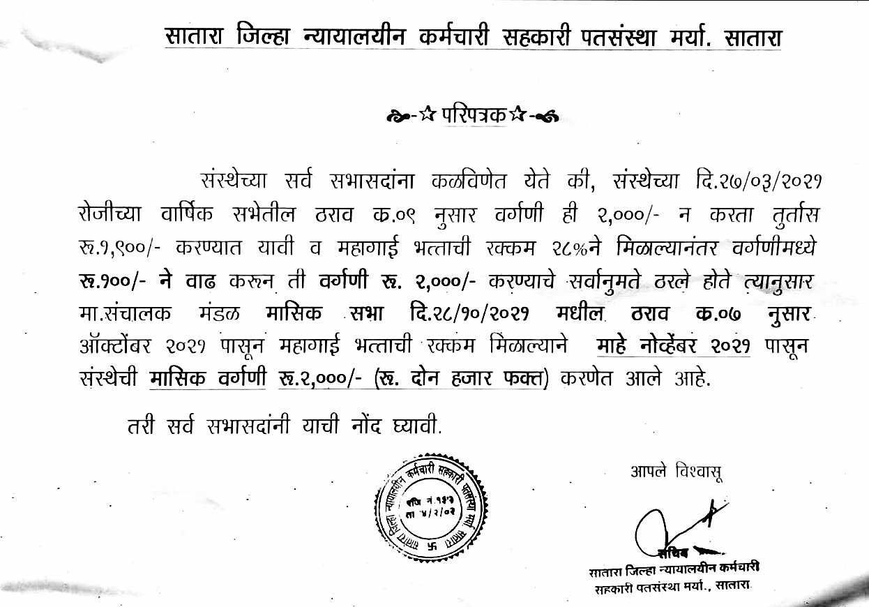 मासिक वर्गणीमध्ये रू.२०० ची वाढ - मासिक वर्गणी रू. २२००/- ![]() |